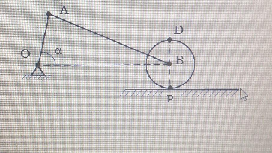 Кривошип OA длинной 50 см вращается равномерно в плоскости рисунка вокруг неподвижной точки O с угловой скоростью w0=1 c-¹. Шатун АВ шарнирно соединён с кривошипом и центром колеса, которое катится без проскальзывания по прямой, параллельной OB. Определите скорость точки D колеса в момент, когда угол между кривошипом и прямой OB равен 90.