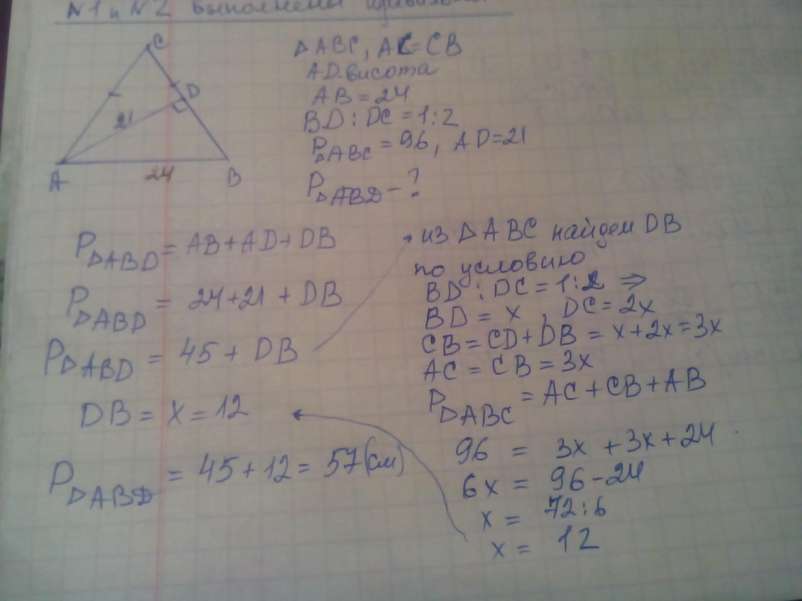 у рівнобедренному трикутнику ABC із кутом при вершині C проведено висоту AD. Обчислити периметр трикутника ABD якщо BD : DC=1:2 і AB= 24 см; периметр трикутника ABC=96 см, AD=21 см