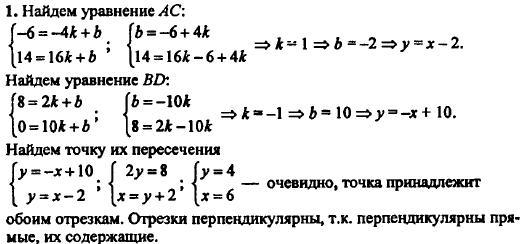 Даны точки A(-4;-6), B(2;8), C(16;14) и D(10;0). Докажите, что отрезки AC и BD пересекаются и взаимно перпендикулярны