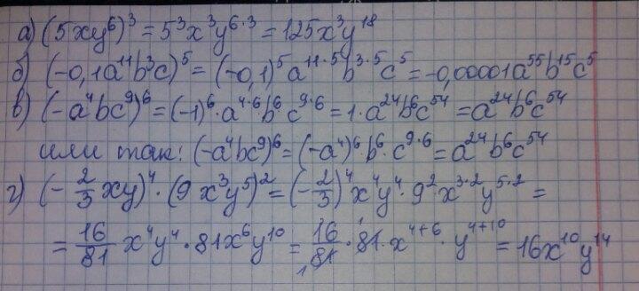 Возведи одночлен с степень:а)(5xy^6)^3= б)(-0,1a^11b^3c)^5= в)(-а^4bc^9)^6= г)(-2/3xy)^4•(9x^3y^5)^2=