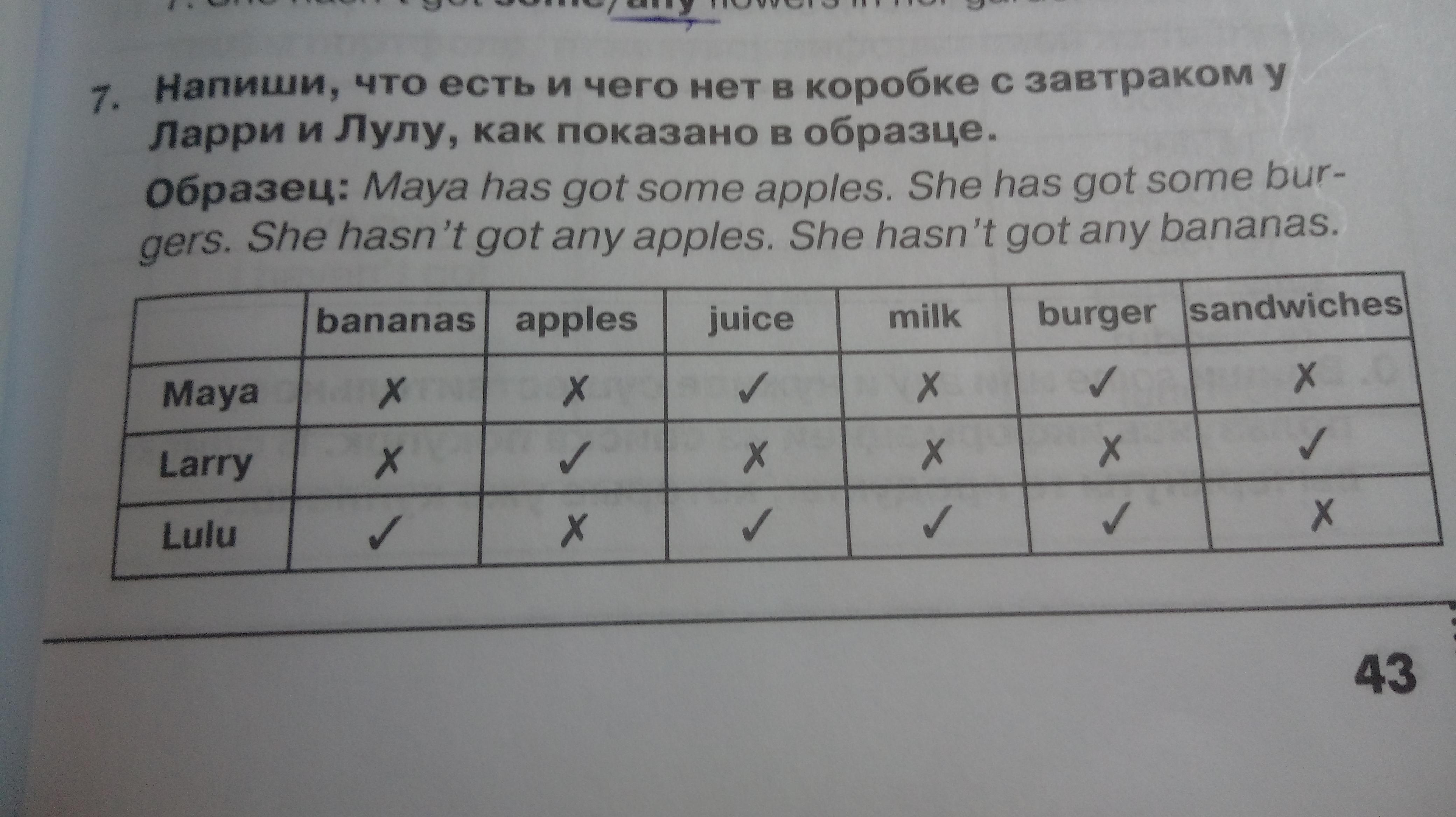 2.Larry has got some apples. He has got some sandwiches. He hasn't got any bananas. He hasn't got any juice. He hasn't got any milk. He hasn't got any burger.