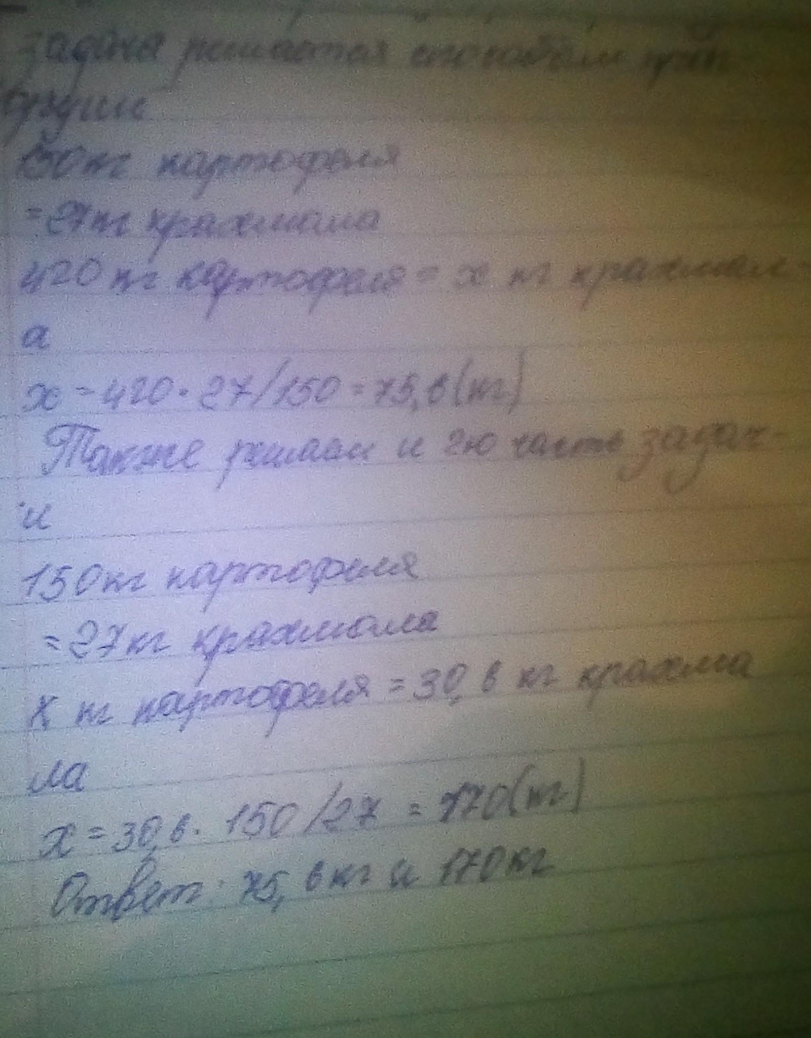1) Помогите срочно!!! Из 150 кг картофеля получают 27 кг крахмала. Сколько крахмала получат из из 420 кг картофеля?