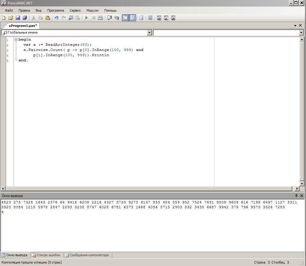 Дан целочисленный массив из 50 элементов. Элементы массива могут принимать целые значения от 0 до 10 000 включительно. Опишите на естественном языке или на одном из языков программирования алгоритм, позволяющий найти и вывести количество пар элементов массива, в которых оба числа трёхзначные. В данной задаче под парой подразумевается два подряд идущих элемента массива.