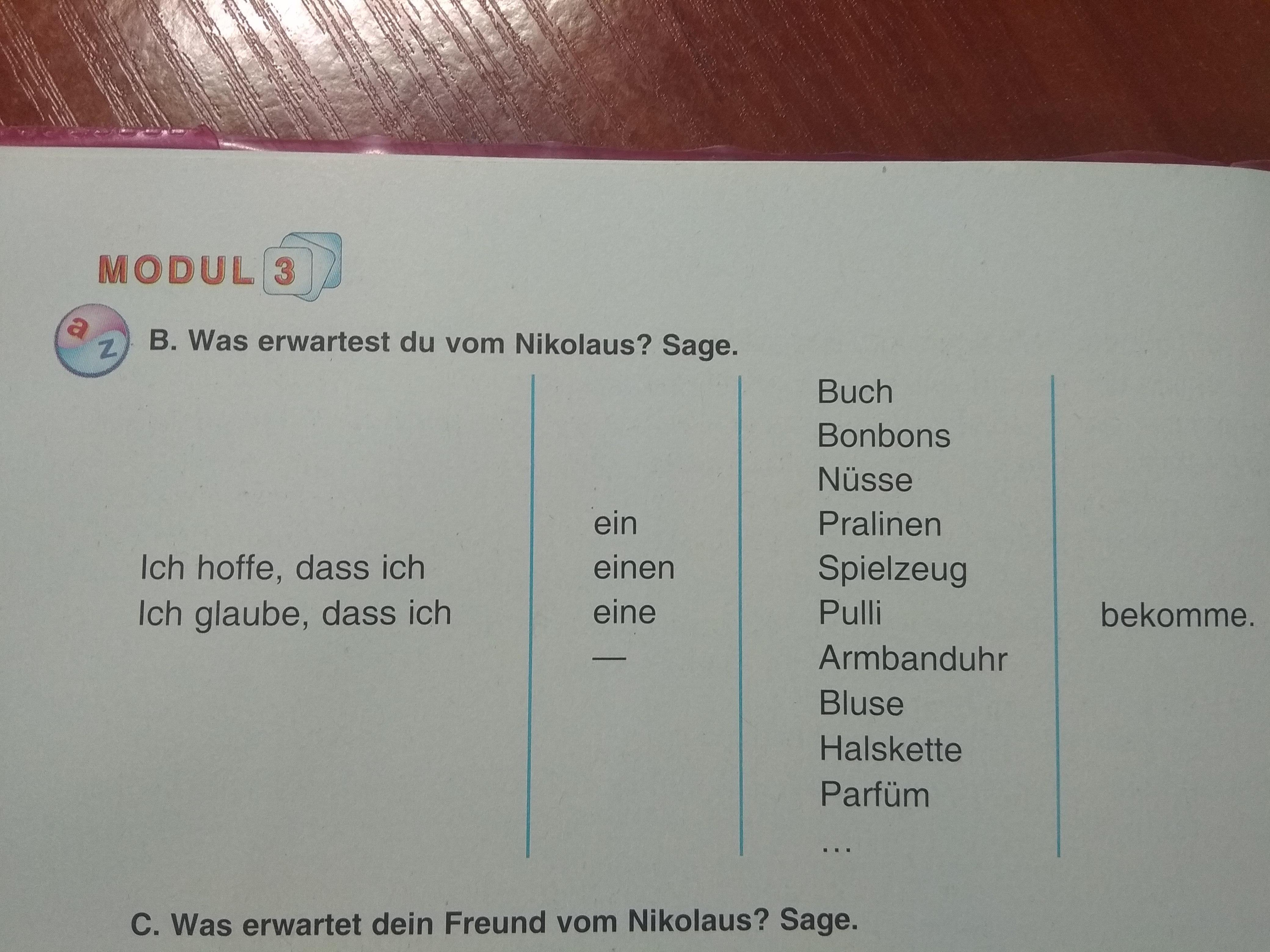 2. Ich glaube, dass ich ein Buch/ ein Spielzeug/ ein Parfüm bekomme.