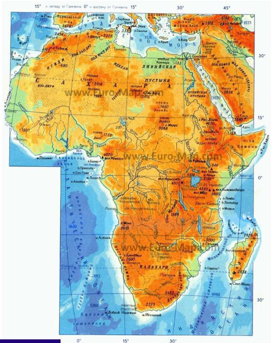 Африка-второй по величине материк, находящийся во всех полушариях. Африка пересекается экватором почти по середине,0 меридианом пересекается в западной части.