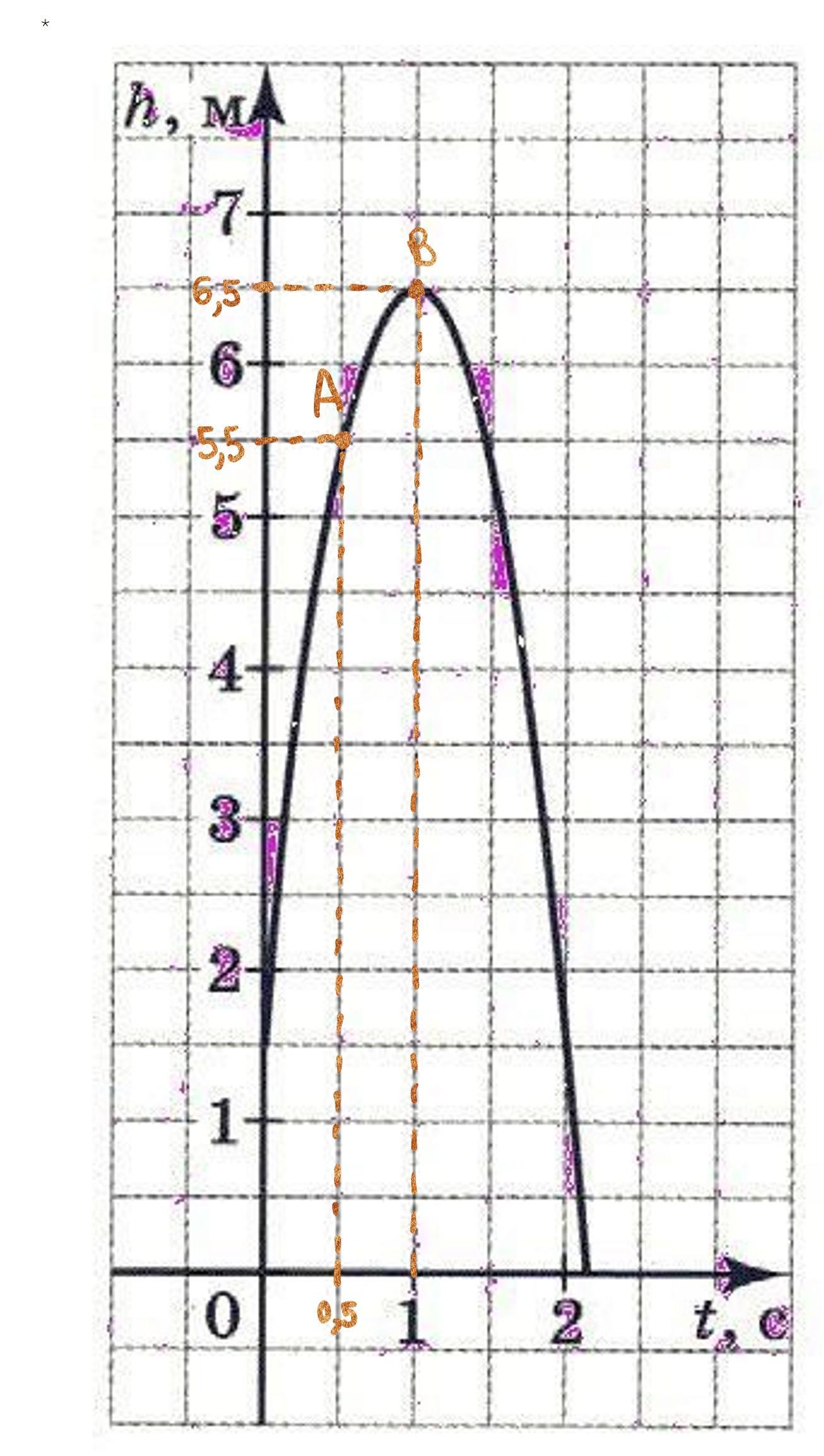 При t = 0.5с, h = 5.5 м (точка A)