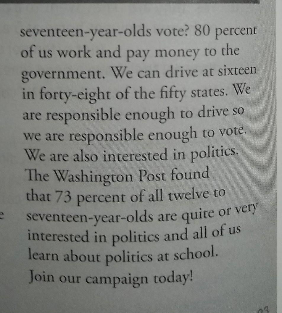 Голос семнадцатилетних/семнадцатилетние голосуют? 80 процентов из нас работают и платят деньги правительству. Мы можем водить начиная с шестнадцати лет в сорока восьми из пятидесяти штатов. Мы достаточно ответственные чтобы водить, значит мы достаточно ответственные чтобы голосовать. Мы также заинтересованы в политике. Вашингтон пост(?) выяснил, что семьдесят три процента от всех двенадцати-семнадцатилеток довольно или очень заинтересованы в политике и все из нас изучают политику в школе.