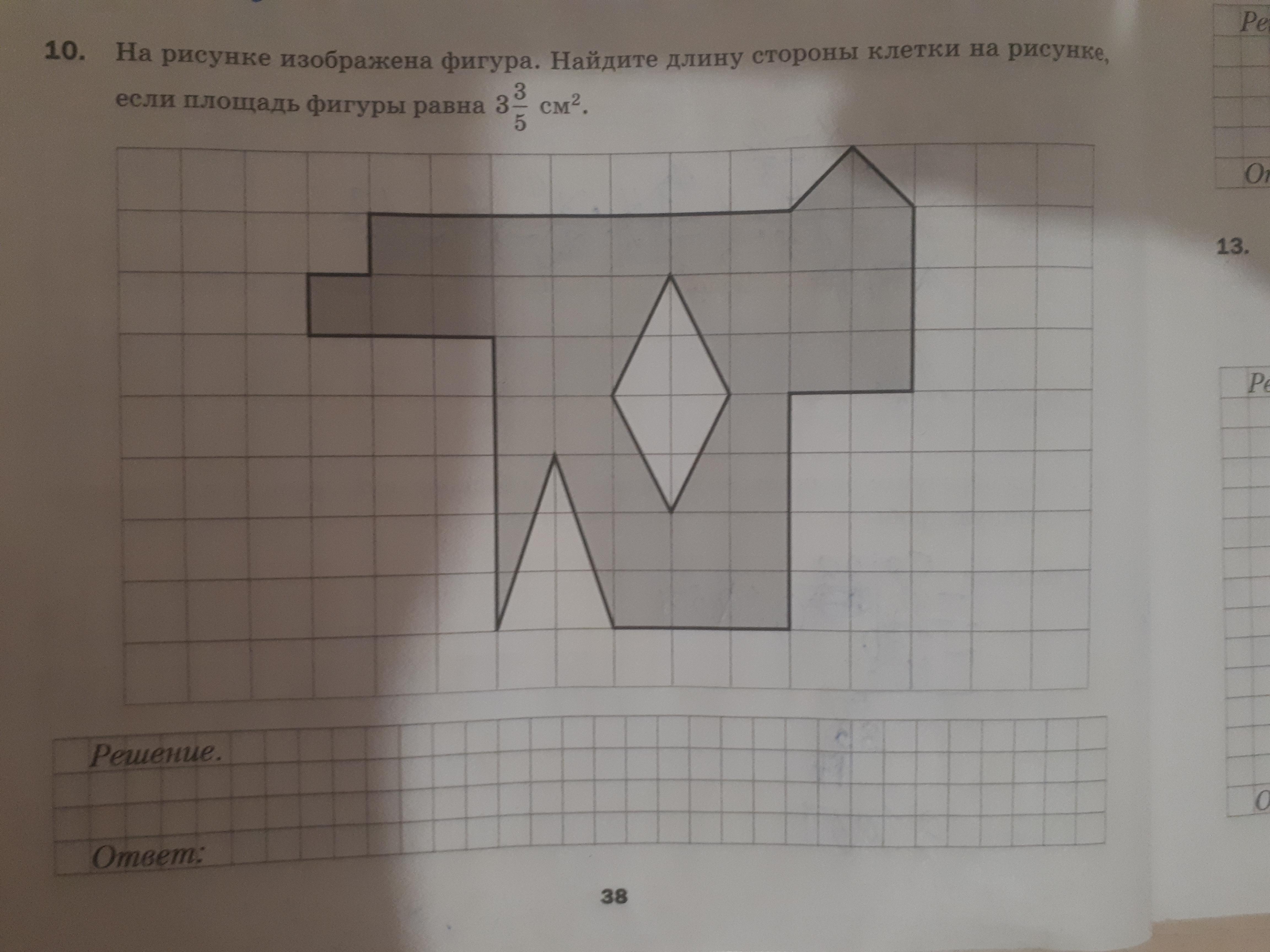 на рисунке изображена фигура. Найдитедлину стороны клетки на рисунке, если площадь фигуры равна 3 3/5 см2