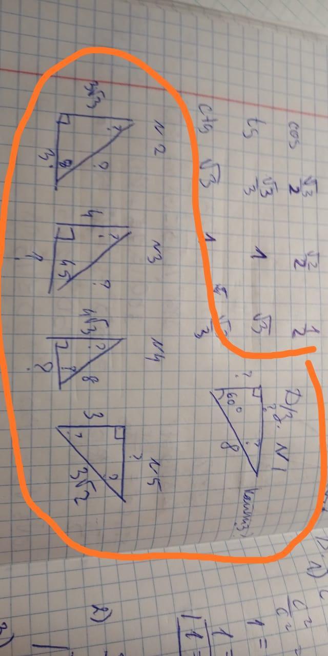 Номер 3: угол = 45°; нижний катет = 4; гипотенуза = 4 корня из 2;
