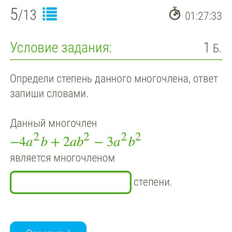 Степень многочлена является : 4