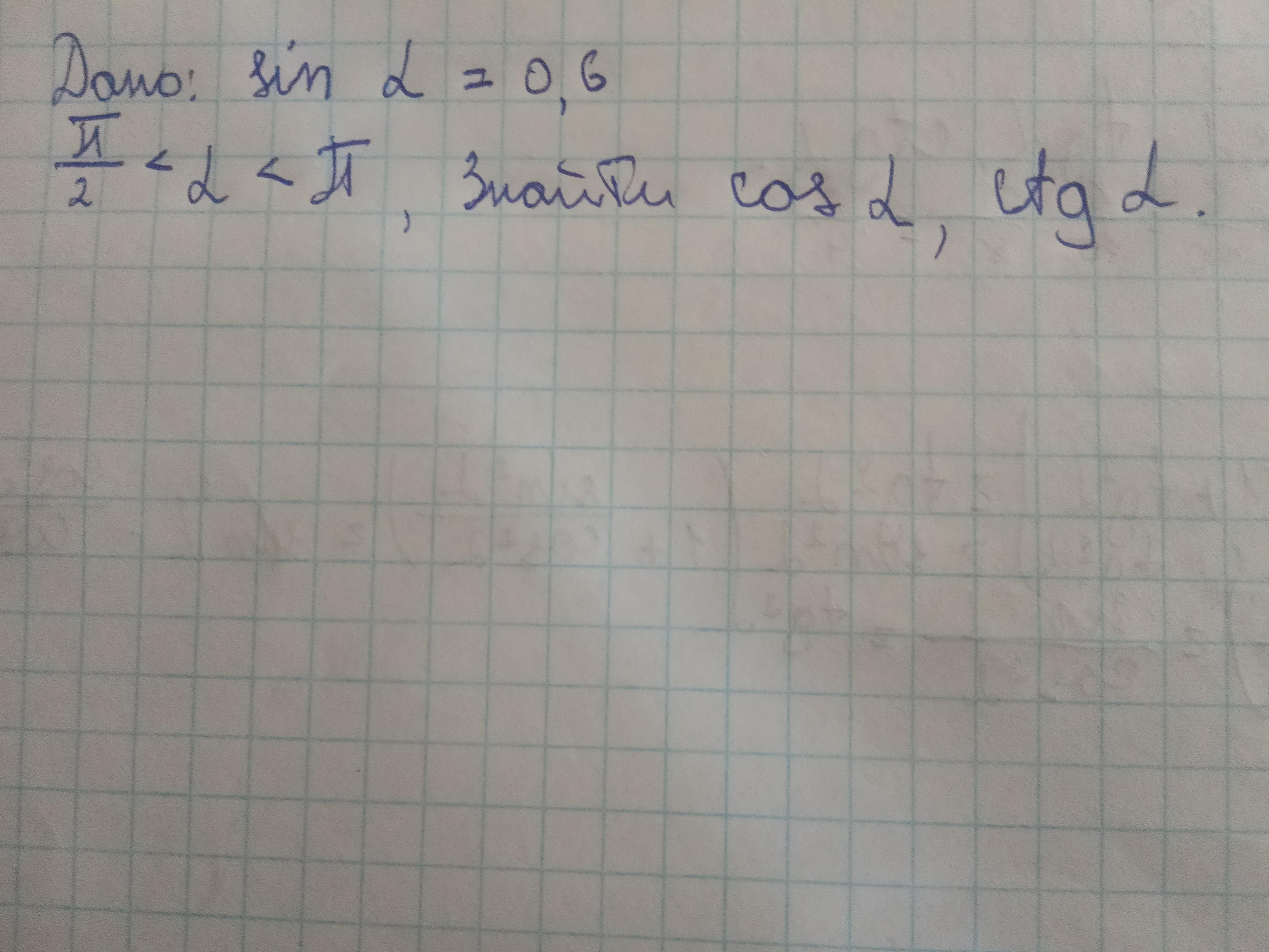 Объяснение:косинус и котангенс в этой четверти отрицательный. Косинус найдёшь из основного тригонометрического тождества: cos^2+sin^2=1, cos=\|1-sin^2=\|1-0,36=\|0,64=0,8. Но знак "-". Котангенс - это отношение косинус к синусу. ctg=cos/sin=-0,8/0,6=-4/3