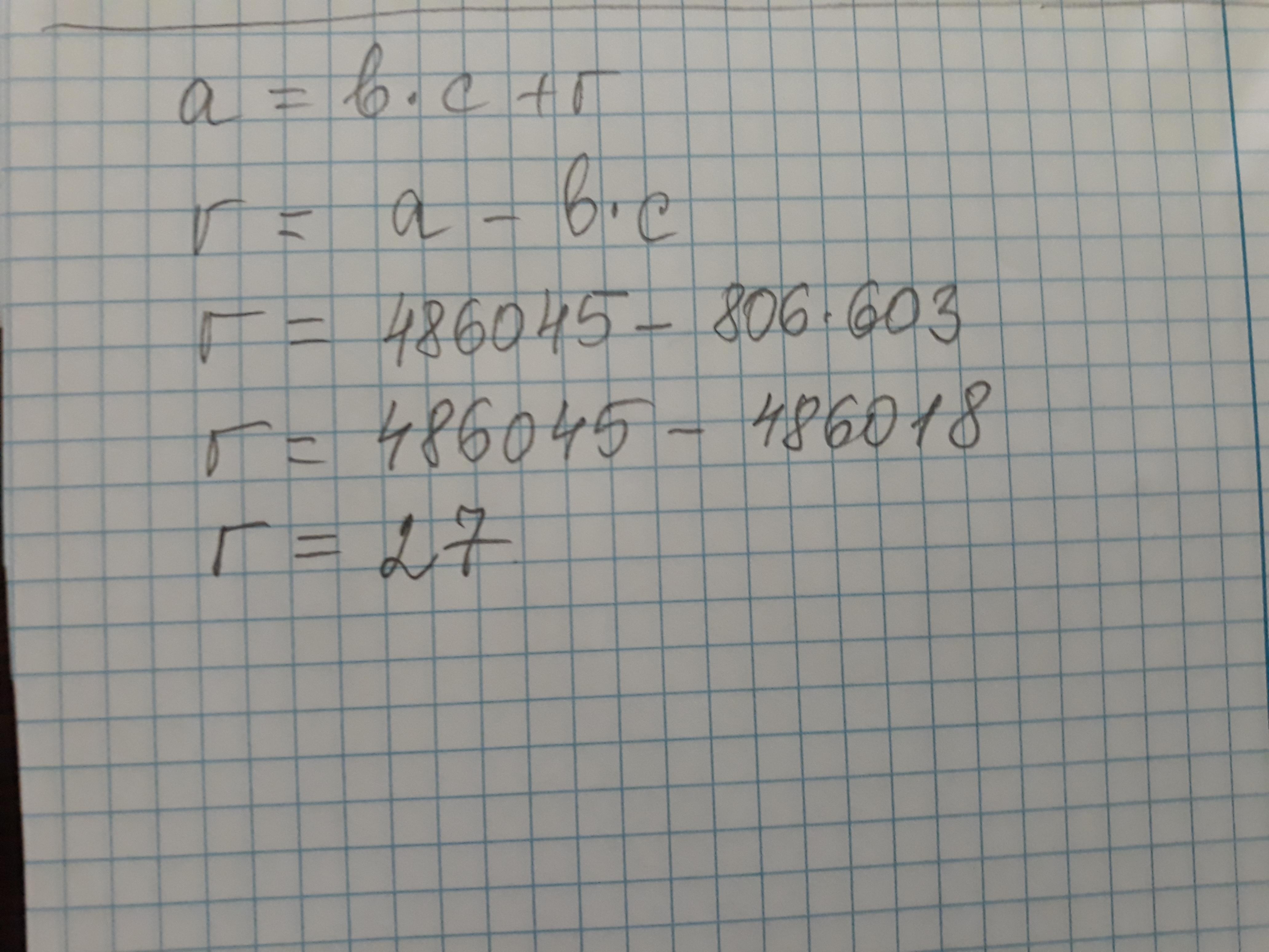 Пользуясь формулой деления числа с остатком a=b*c+r r,если a = 486045 , b =806, c = 603 надо найти остаток это r