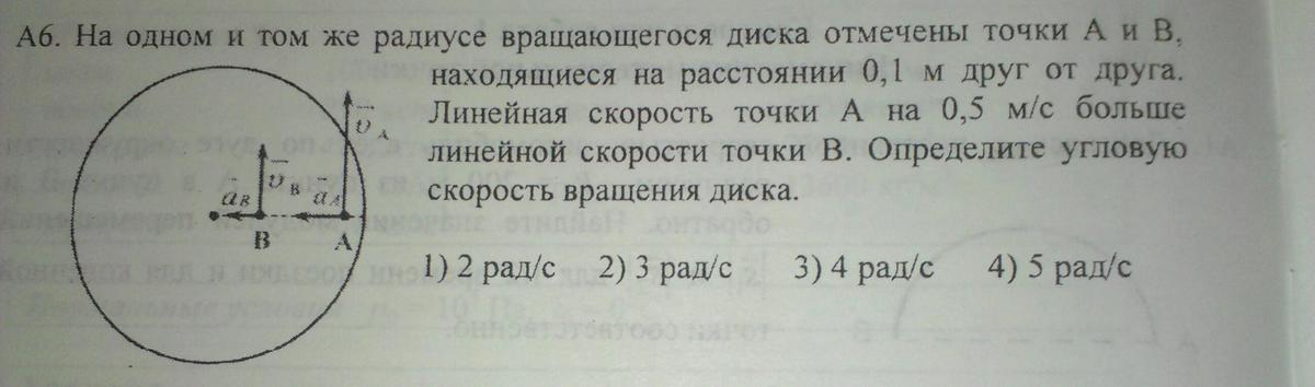 w=∆v/∆r= 0,5/0,1=5 рад/с (ответ 4)