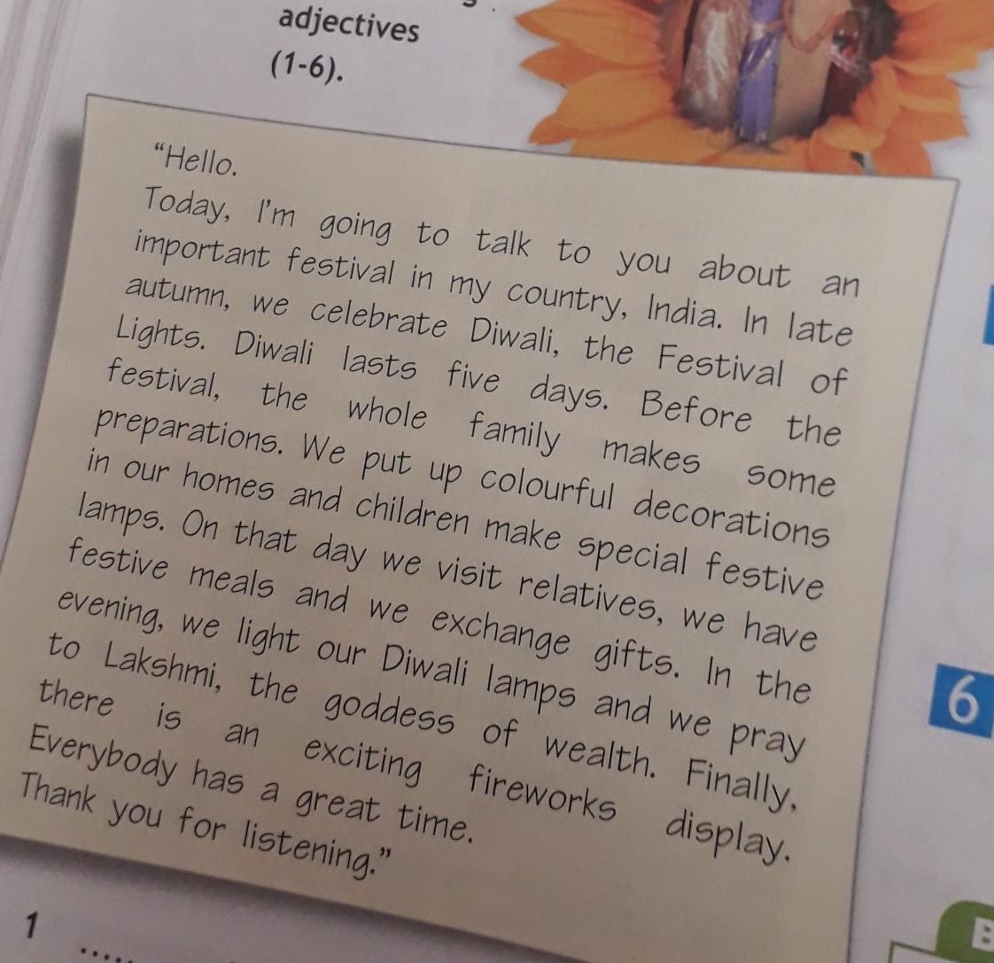Хэллоу тудэй ай м гоинг ту ток ту ю эбаут эн импотант фестиваль ин май кантри, индия. Ин лэйт отм ви сэлэбрэйт дивали зе фестиваль оф лайтс. Дивали ластс файв дэйс. Бефо зе фестиваль зе ввол фэмили мэйкс сам препарэйшон. Ви пут ап колофул декарэйшон ин аор хомс энд чилдрен мэйк спэшал фестиваль лэмпс. Он вэт дэй ви визит рилэйтивс ви хэв фистив милс анд ви эксчендж гифтс.