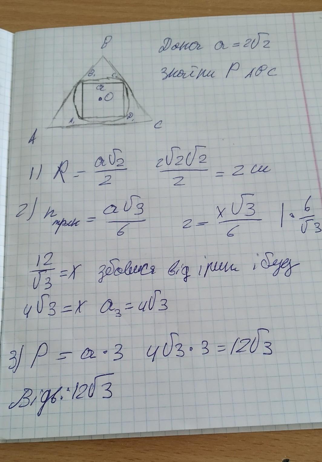 Навколо квадрата зі стороною 2√2 см описано коло, навколо якого описано рівносторонній трикутник. Знайдіть периметр трикутника.