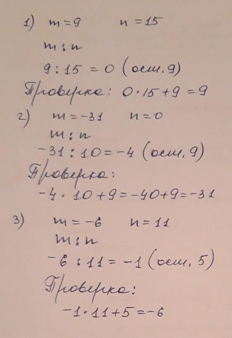 найдите неполное частное и остаток при делении числа m на число n, если: 1)m=9 n=15 2)m= -31 n=10