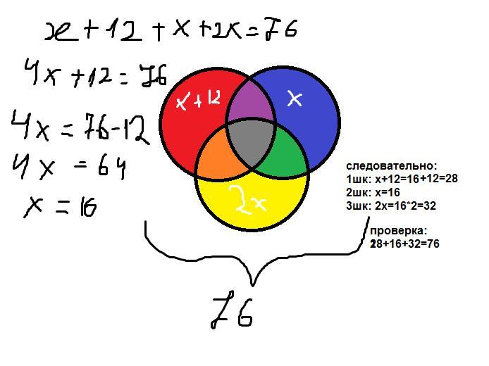 Значит,16 учеников послала вторая школа,тогда первая школа послала 16+12=28 учеников,а третья Школа послала 16•2=32 ученика.