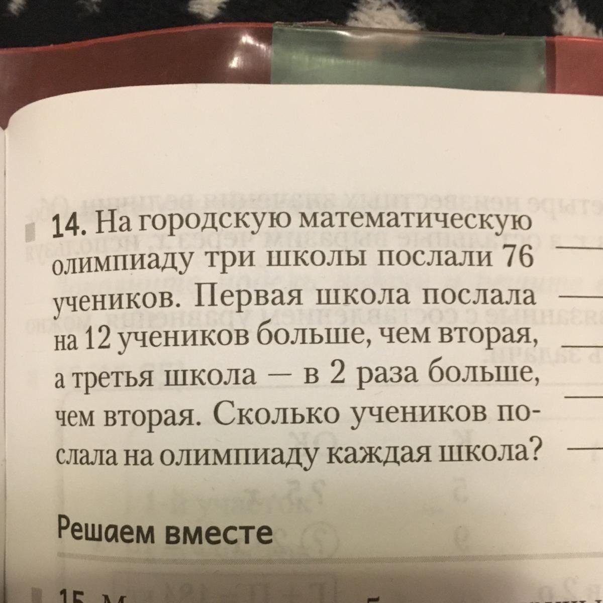 Пусть х учебников послала вторая Школа,тогда первая школа послала х+12 учеников,а третья Школа 2х учеников. Всего на городскую математическую олимпиаду три школы послали 76 учеников.