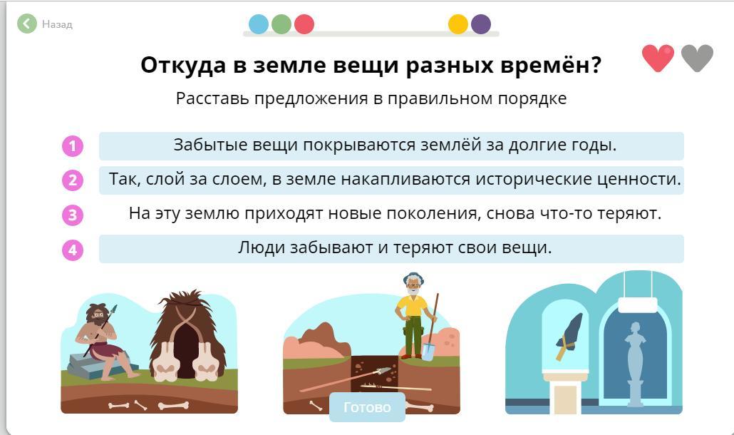 4Люди забывают и теряют свои вещи. 1Забытые вещи покрываются землей. 2Так, слой за слоем , в земле накапливаются исторические ценности. 3На эту землю приходят новые поколения, снова что-то теряют..