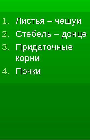 У луковицы укороченный стебель с мясистыми листьями. У корневища и клубня листья редуцированы в виде маленьких чешуек, а стебель хорошо развит.