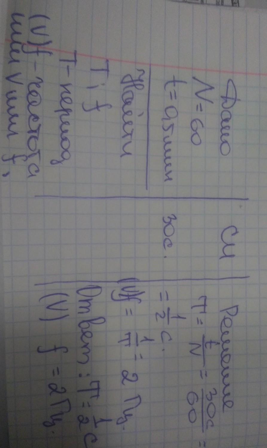 колесо автомобиля вращается равномерно 60 раз за 0,5 минут. Найдите период и частоту вращения колеса)