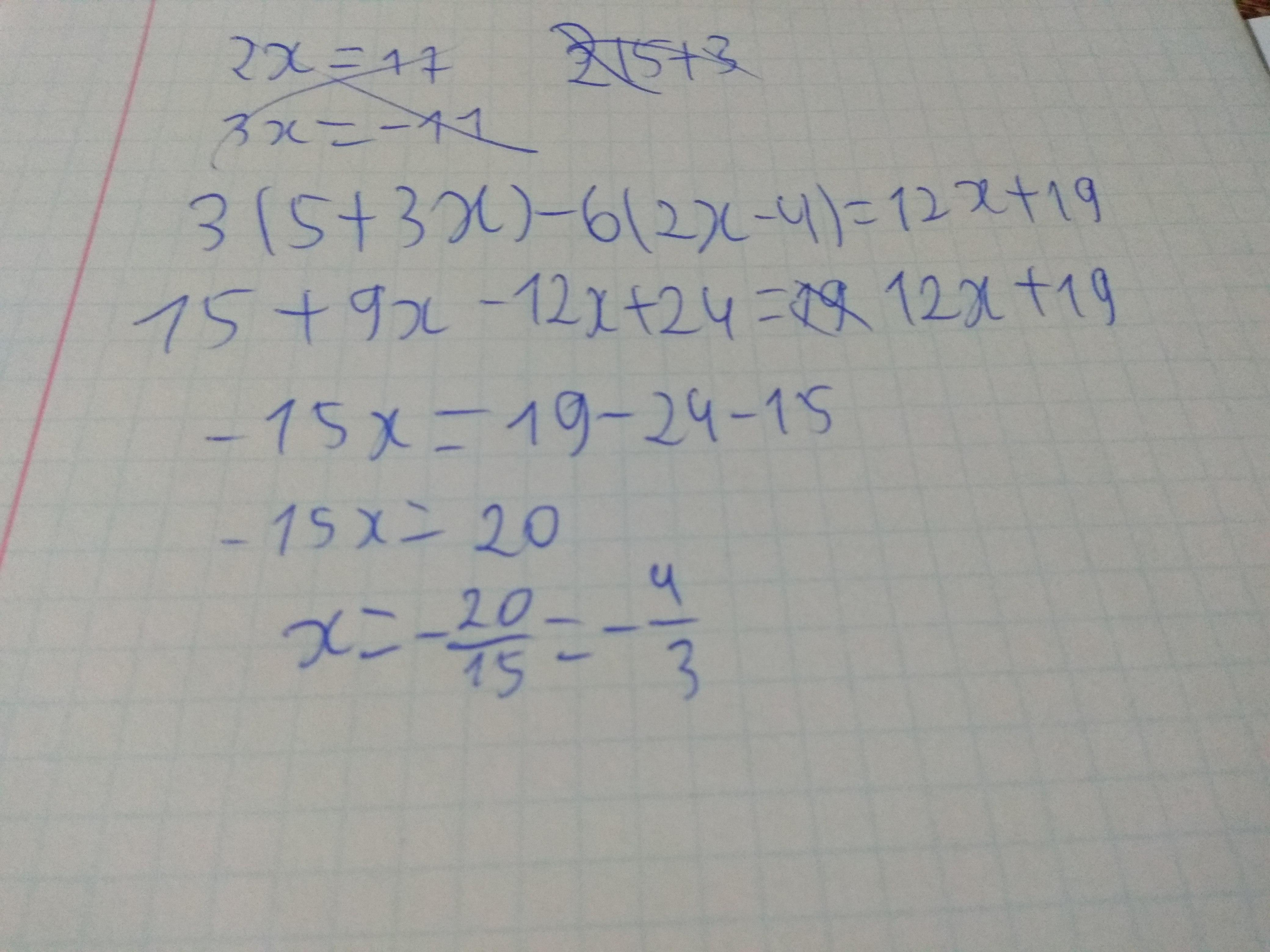 Помогите решить уравнение пожалуйста: 3(5+3х)-6(2х-4)=12х+19