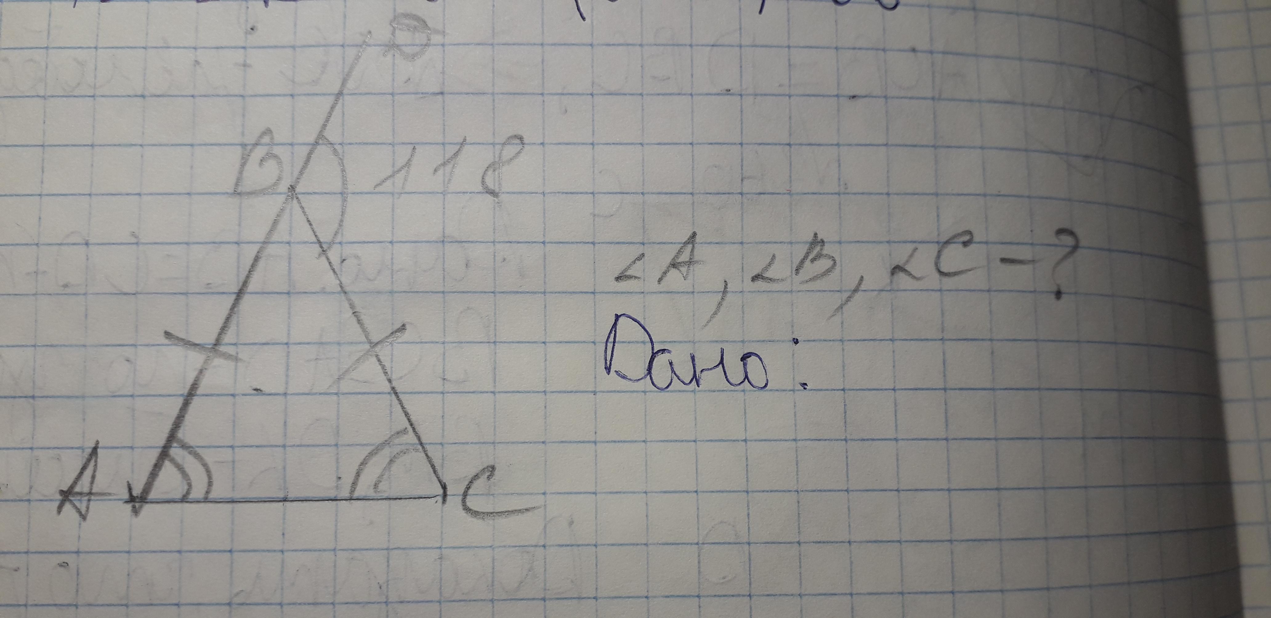 Угол DBC - внешний угол треугольника, тогда по его св-ву Угол А + Угол С = Угол DBC = 118, тогда Угол А = Углу С = 118 : 2 = 59 градусов
