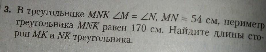 P(MNK) = MN + NK + MK. MK = NK = 54 см. MK = 170 - (MK + NK) = 170-108 = 62 см.