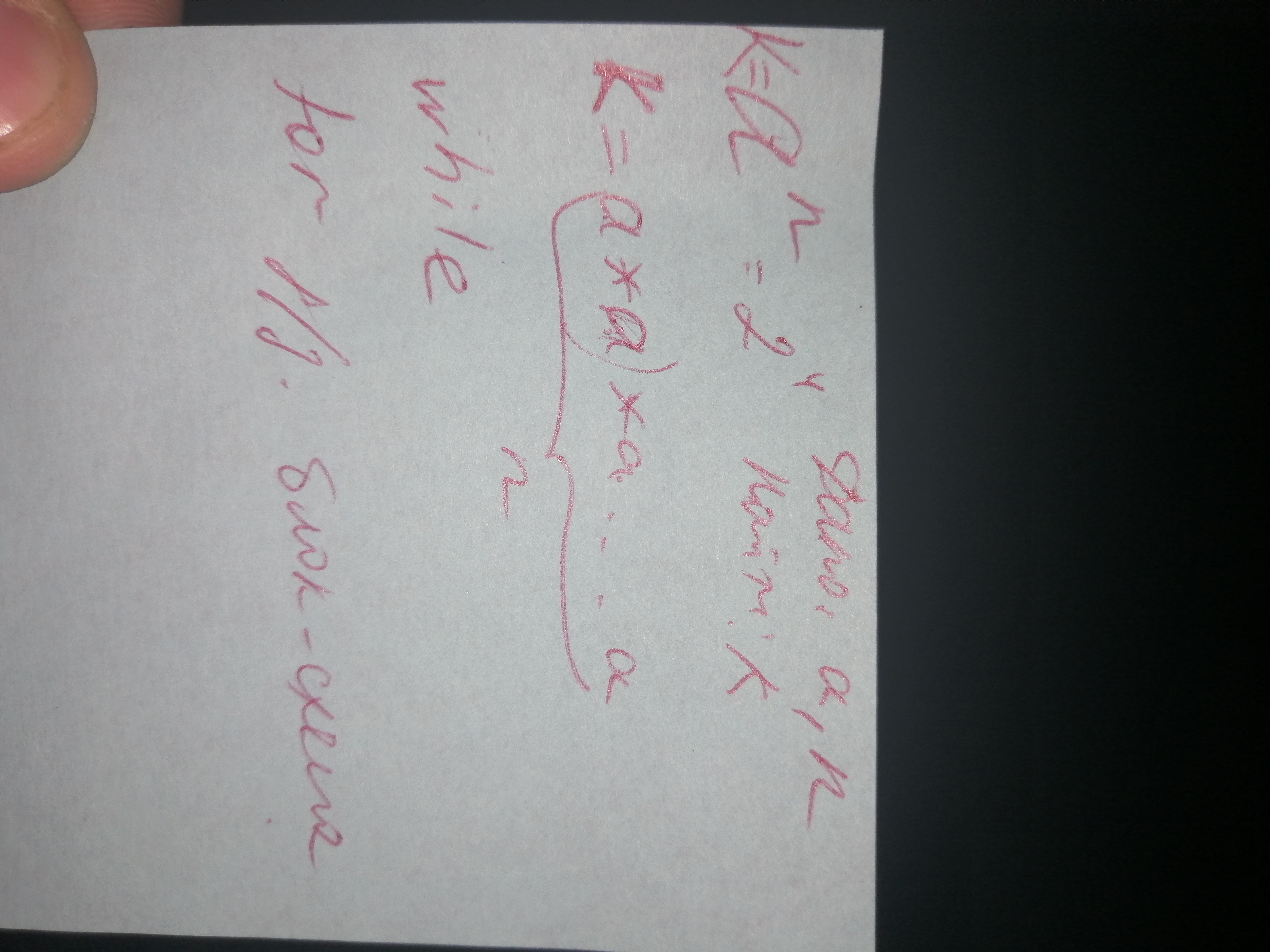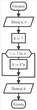 Надо написать две программы на языке Паскаль. Одну с циклом while, а вторую с циклом for. K=a^n (a в степени n). Для программы цилка for нарисовать блок-схему.