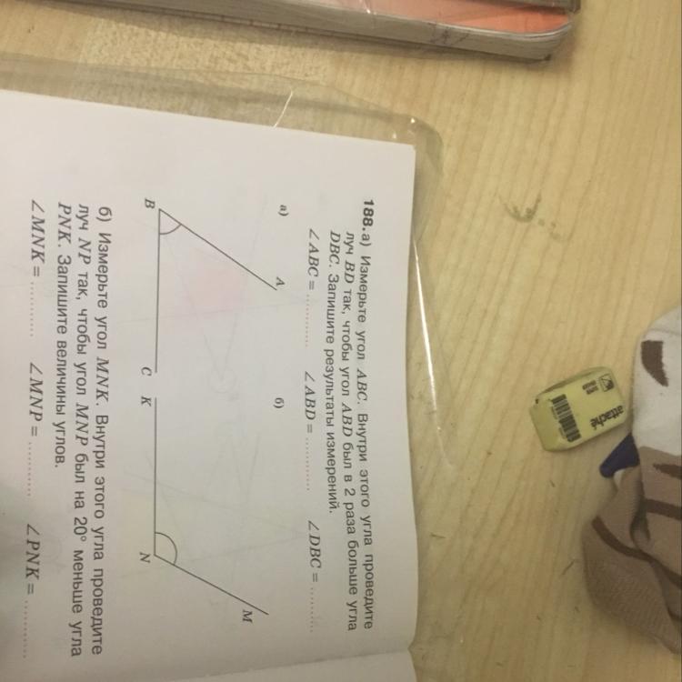 Измерьте угол ABC.Внутри этого угла проведите луч BD так ,чтобы угол ABD был в 2 раза больше угла DBC . Запишите результаты измерений.