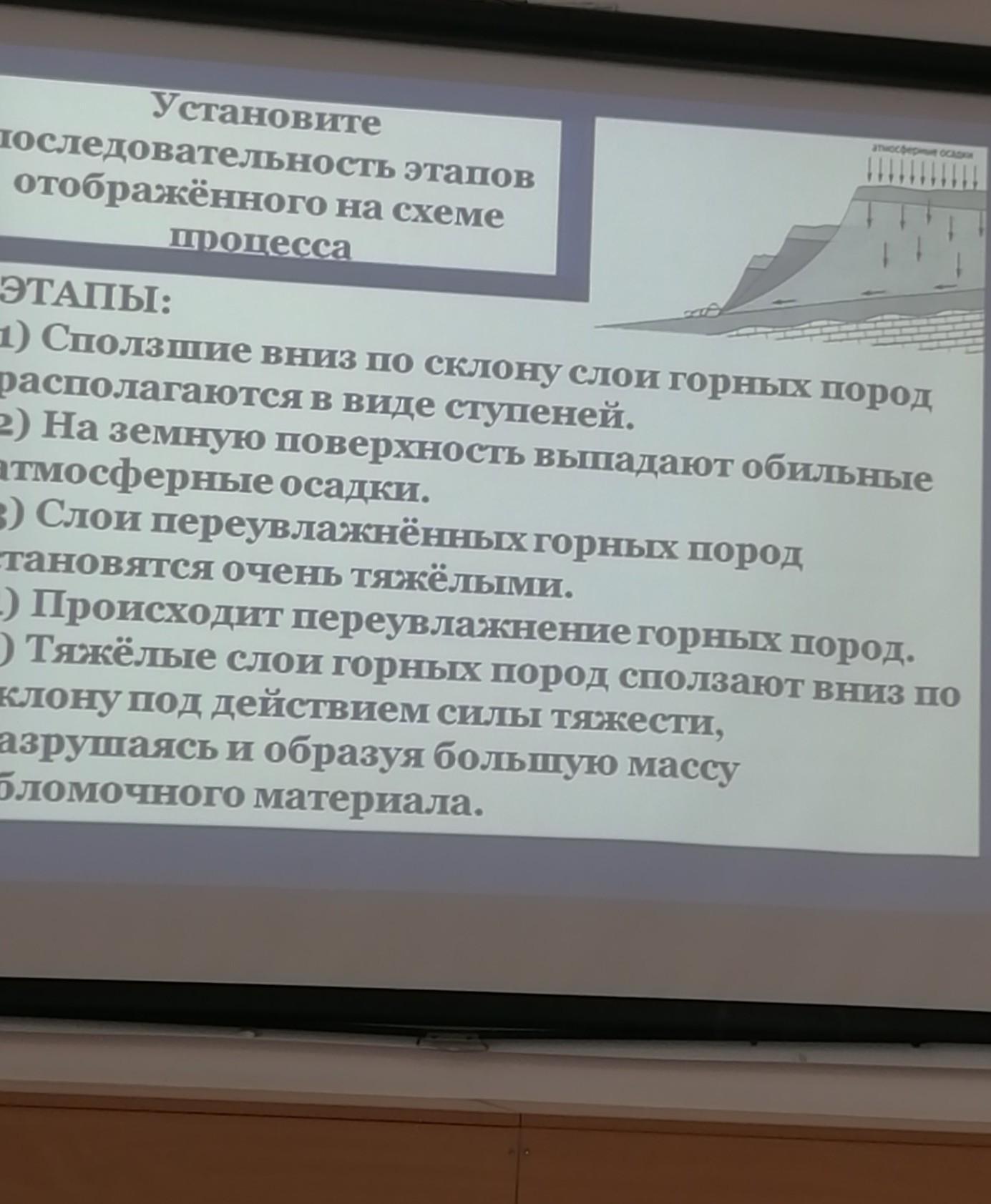 Установите последовательность этапов отображённого на схеме пропесса этапы: 1) Сползшие вниз по склонуслои горных пород располагаютсяв виде ступеней. 2) На земную поверхность выпадают обильные атмосферные осадки. 3) Слои переувлажнённыхгорных пород становятся очень тяжёлыми. 4) Происходит переувлажнение горных пород.