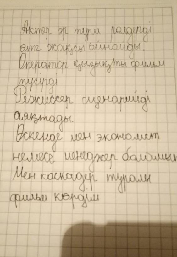 Придумайте предложение на казахском языке со словами: кинодраматург, режисер, актер, оператор, суретші, композитор, продюсер, каскадер, экономист, менеджер.