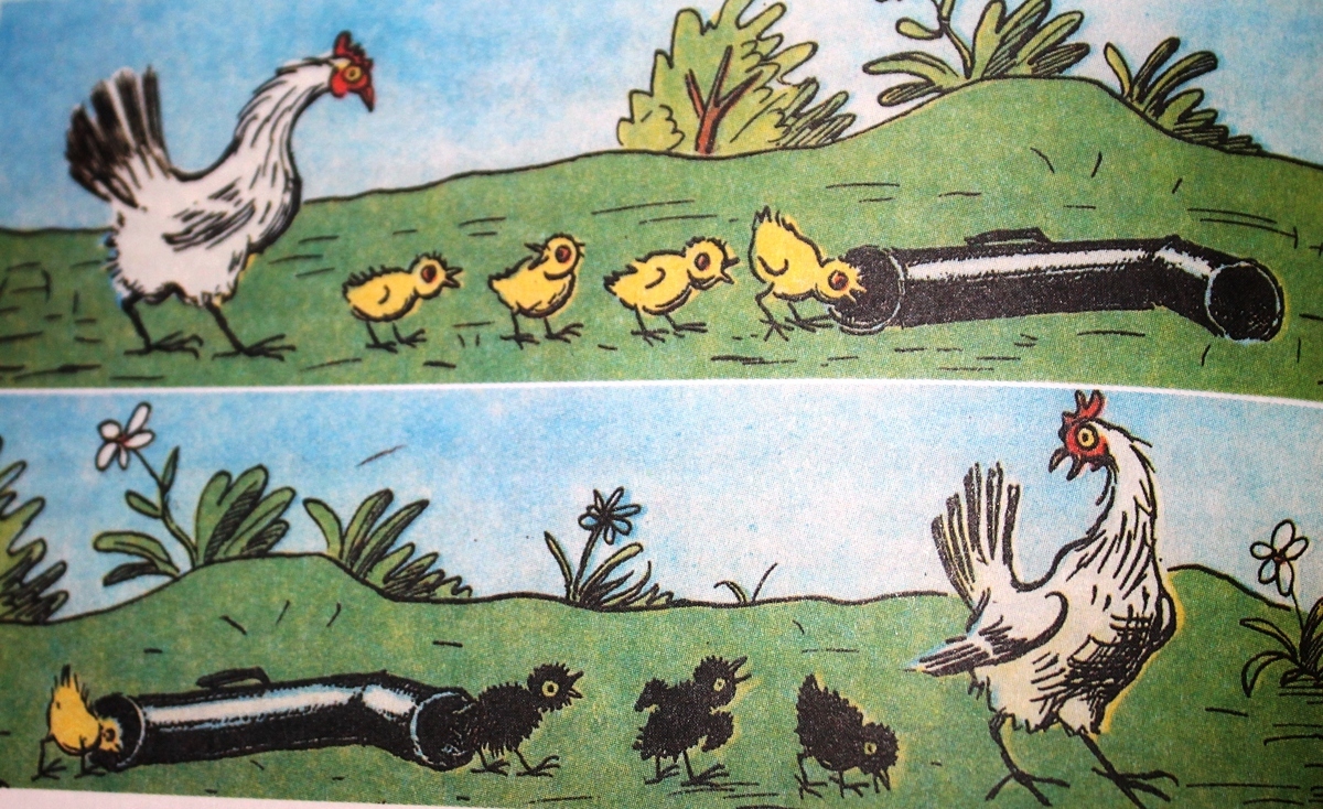 Однажды курица решила показать своим циплятам зеленый луг. Она построила их друг за дружкой и они весело на прогулку. Курица важно шла впереди. рассказвыая циплятам обо всем, что встречалось им на пути. Когда на дороге оказалась труба, курица важно обошла ее. Но циплята решили исследовать этот новый предмет и полезли внутрь. Когда курица оглянулась. то замерла от испуга - позади нее, весело подпрыгивая на кочках, бежали вместо ее циплят черные птенчики.