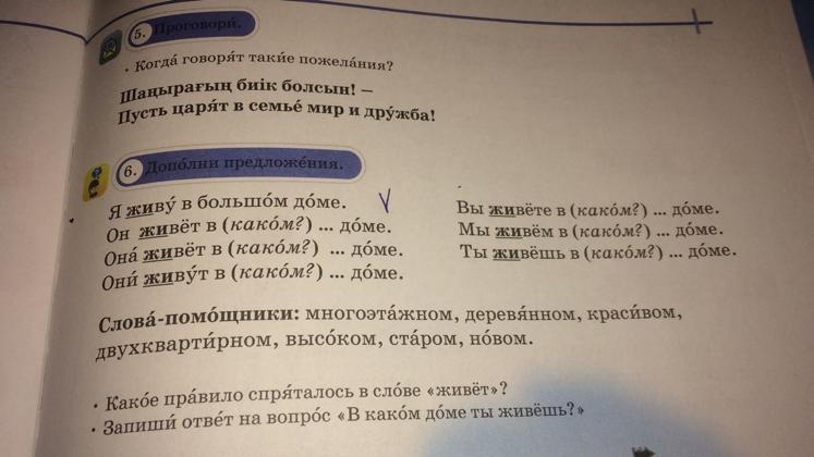 Он живёт в высоком доме. Она живёт в старом доме. Они живут в многожтажном доме. Вы живёте в новом доме. Мы живём в двухквартирном доме. Ты живёшь в деревянном доме.