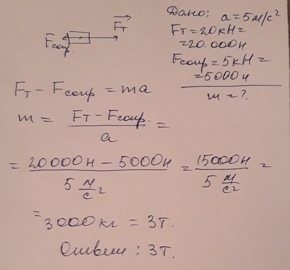 ma=Fт-Fс, m= (20000-5000)/5= 3000 кг