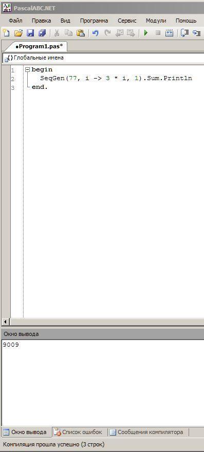 составить программу задающую последовательность чисел кратных 3 из 77 элементов и находящую сумму всех чисел последовательности.щ