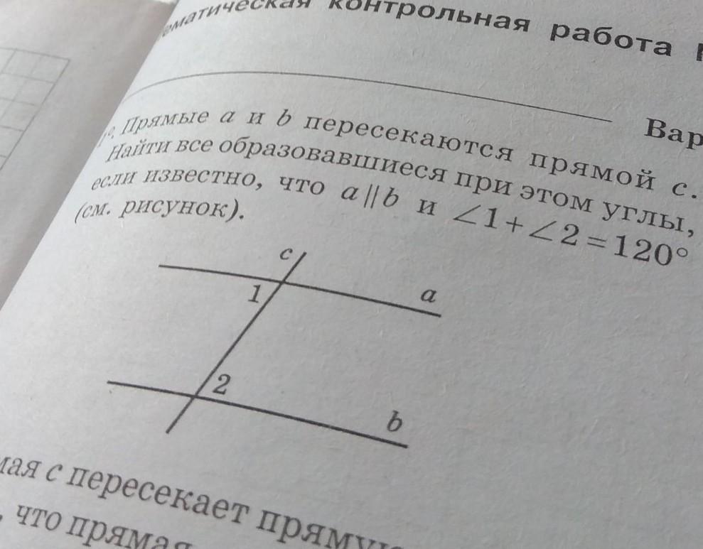 Далее, образовавшиеся при этом углы, смежные с углом 1 и углом 2 , по свойству смежных углов равны 180-60=120