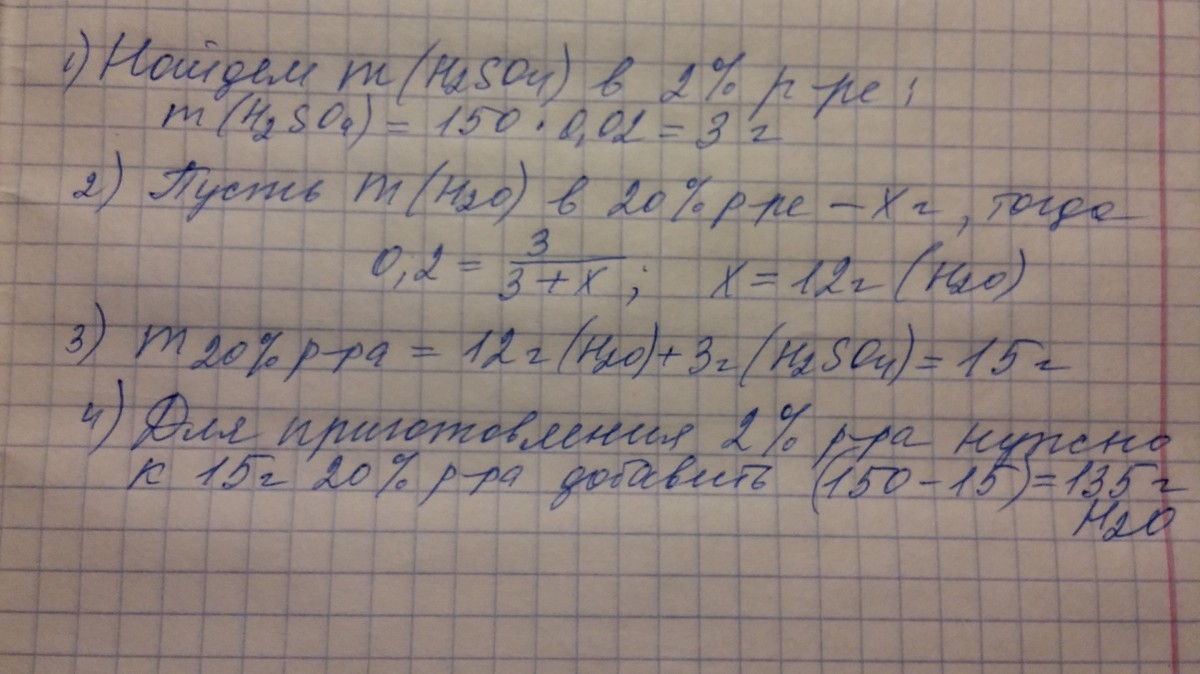 Из 20% раствора серной кислоты получить 150 г двух % раствора этого же вещества. Помогите решить пожалуйста.