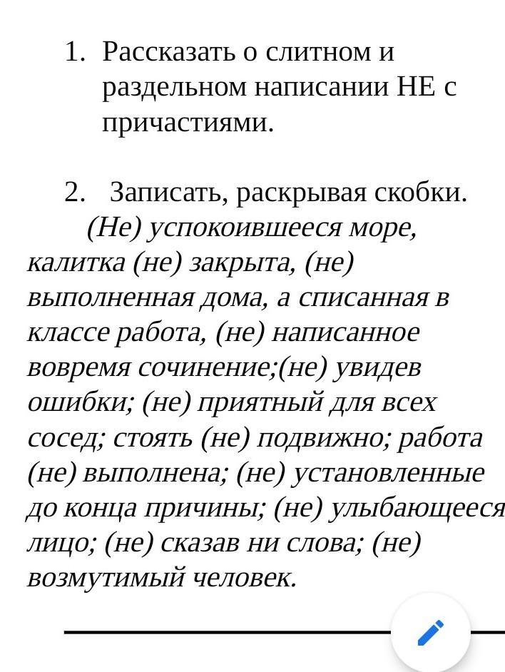 Не успококоившееся море, калитка не закрыта, не выполненная дома, а списанная в классе работа, ненаписаное вовремя сочинение, не увидев ошибки, не приятный для всех сосед, стоять неподвижно, работа не выполнена, не установленные до конца причины, не улыбающееся лицо, не сказав ни слова, не возмутимый человек