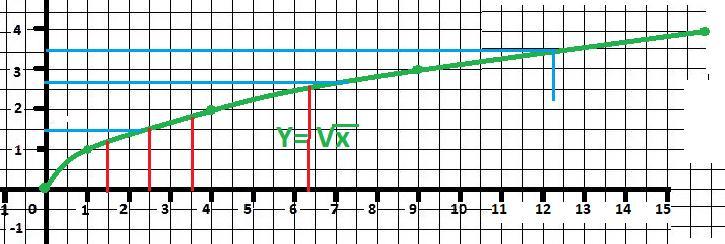пользуясь графиком функции у=корню х,найдите: значение корня х при х =1,5; 2,5; 3,5; 6,4: значение х,которому соответствует корню х=1,5; 2,7; 3,5: