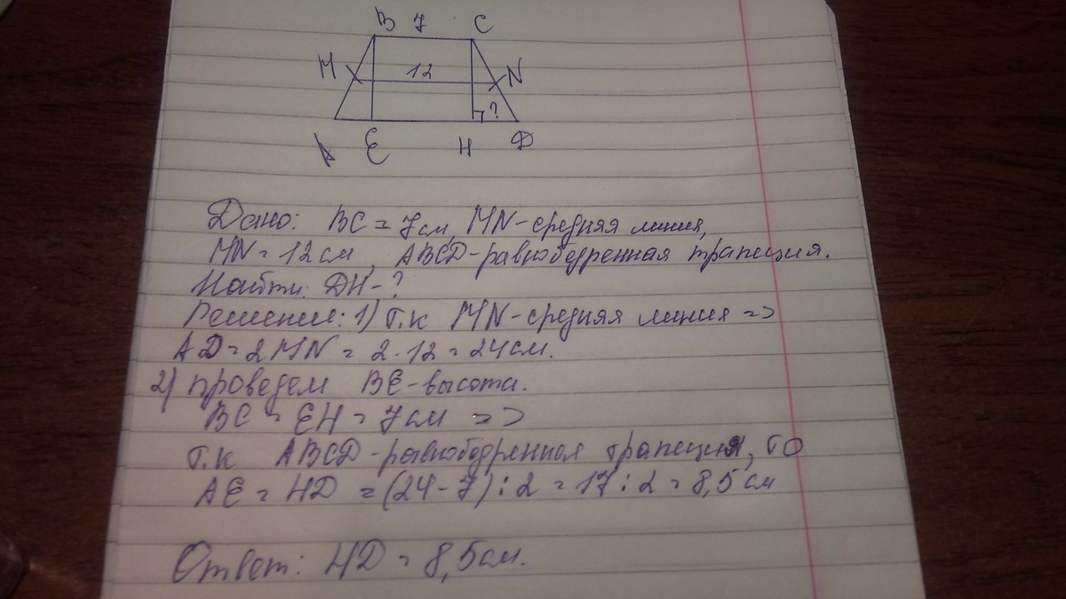 В трапеции ABCD боковые стороны AB и CD равны, CH - высота, проведённая к большему основанию AD. Найдите длину отрезка DH, если средняя линия MN равна 12, а меньшее основание BC равно 7.