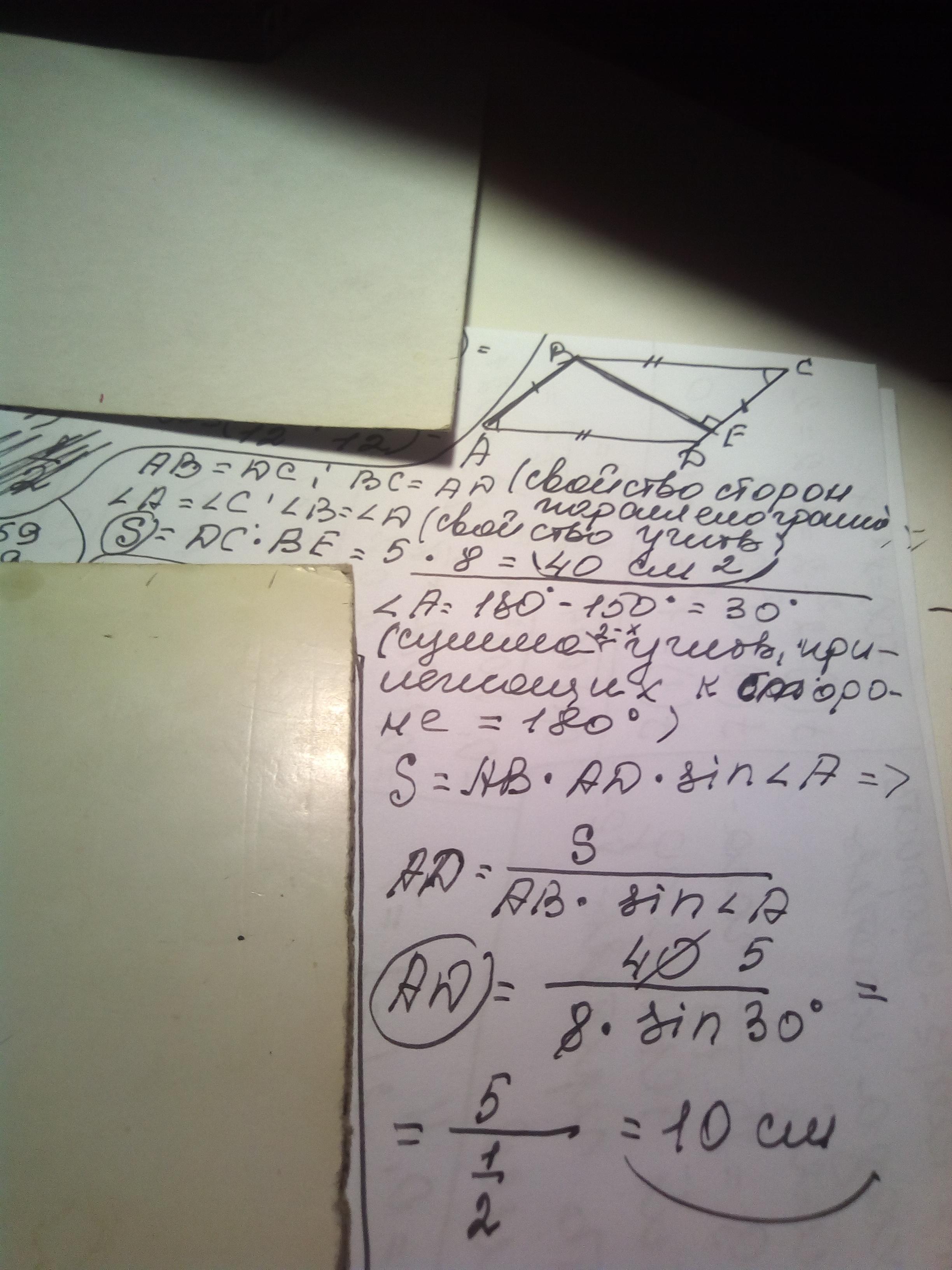 Найдите сторону AD и площадь параллелограмма ABCD если AB=8см,угол B=150градусов высота, переведённая из вершины B к прямой DC, равна 5 см