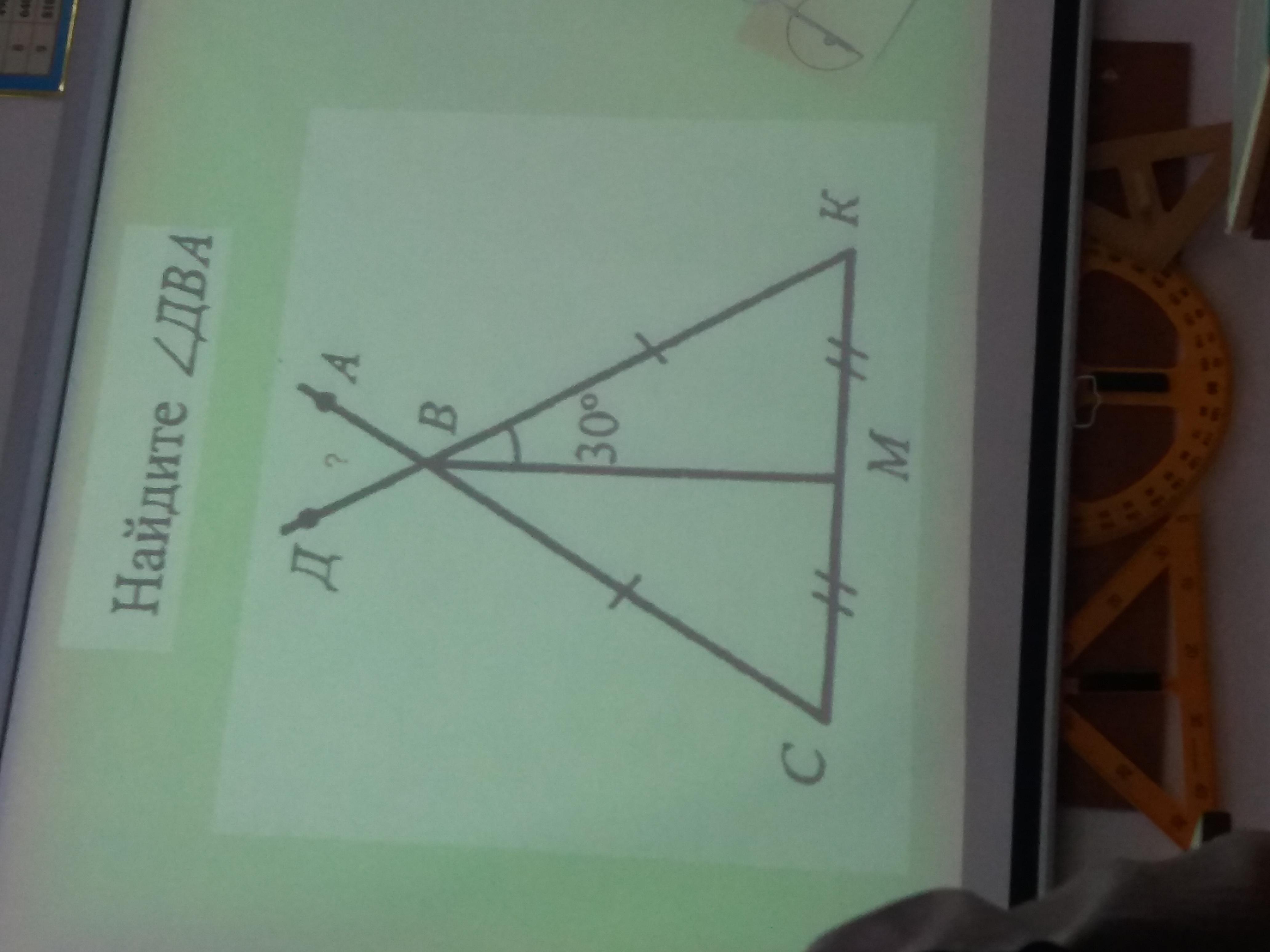 Объяснение: BMC=BKM по трем сторонам: BC=DK, MK=CM, BM - общий отрезок => <C=<K => CBK = равнобедренный => BM - биссектриса => <CBK=30*2=60. ДБА=CBK как вертикальные