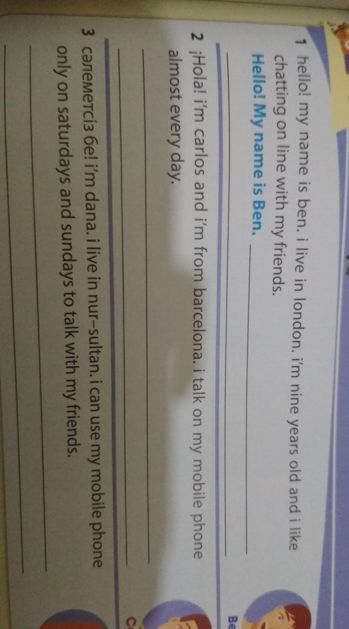 1. Hello! My name is Ben. I live in London. I am nine years old and I like chatting online with my friends.