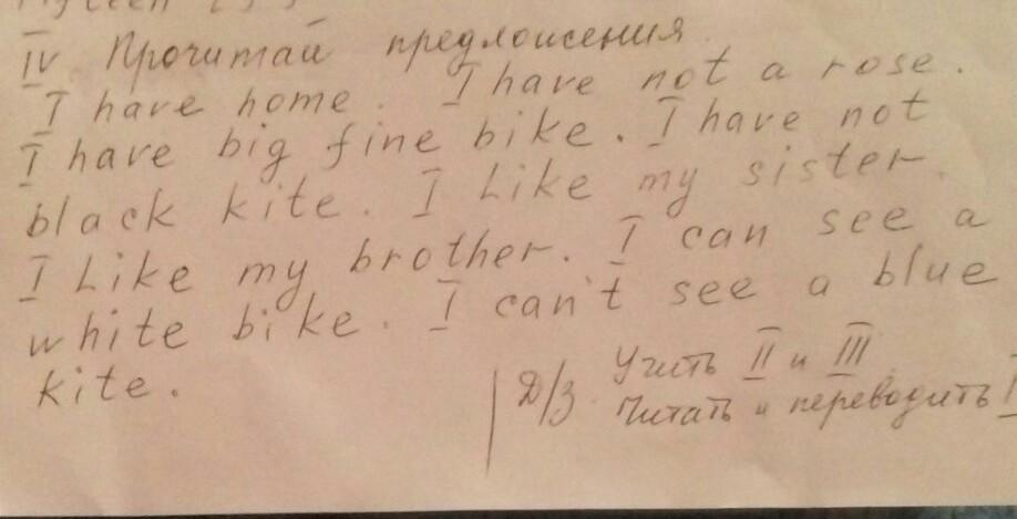 У меня есть дом. У меня нет розы. У меня есть большой отличный велосипед. У меня нет чёрного воздушного змея. Я люблю свою сестру. Я люблю своего брата. Я могу видеть/вижу белый велосипед. Я не могу видеть/не вижу голубого/синего воздушного змея