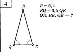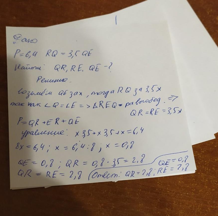 так как угол Qравен углу E то треуголник равнобедр. следовательно QR= RE=3.5, P= QR+RE+EQ=6.4Ну а дальше я не в силах)