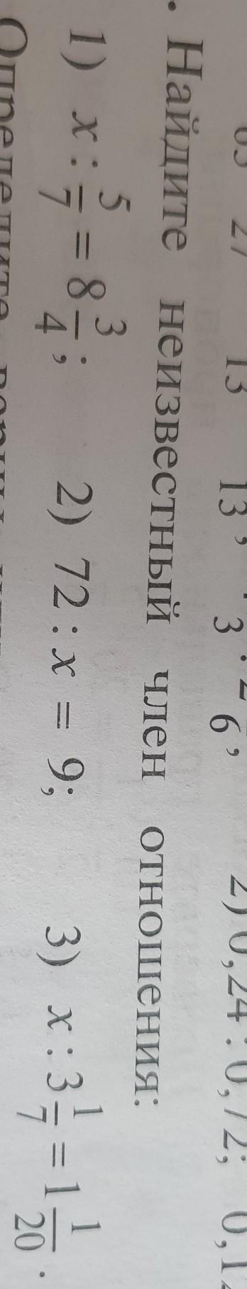 Найдите известный член отношения : 1) х : 5/7 = 8 3/4 ; 2) 72 : х 9 ; 3) х : 3 1/7 = 1 1/20
