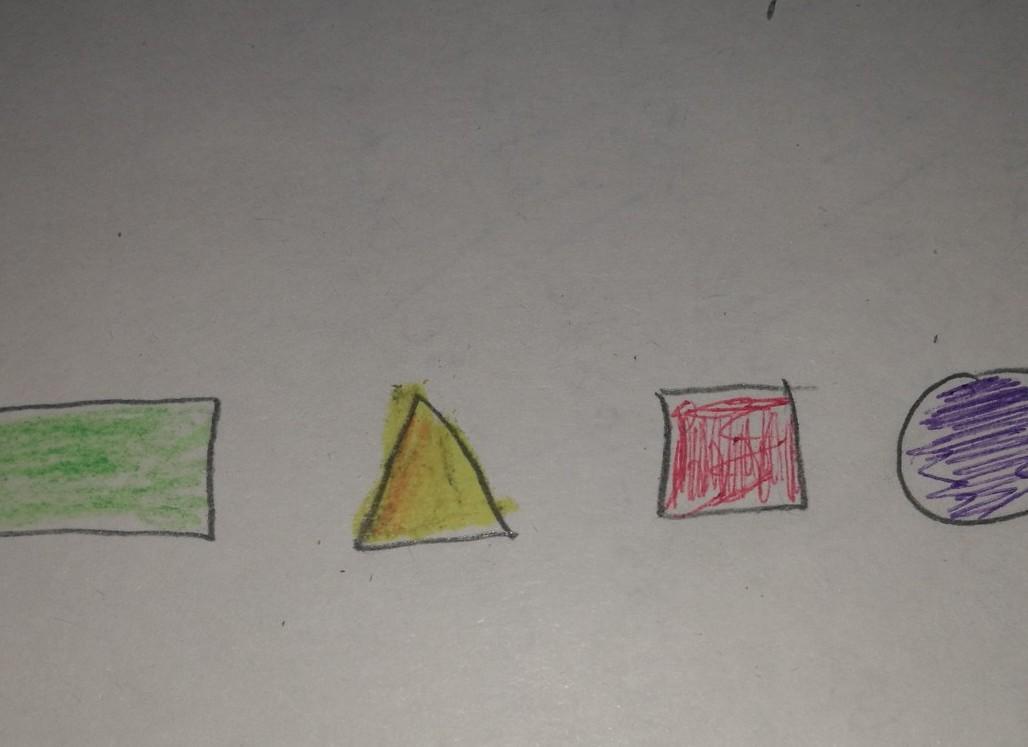 Зелёный прямоугольник -> жёлтый триугольник -> красный квадрат -> синий круг.