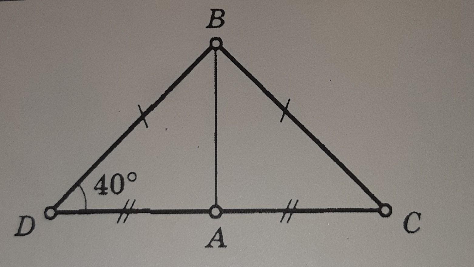 Объяснение: Т.к. треугольник DBC р/б, то ВА явл. и биссектрисой угол D равен углу C и равет 40 градусов. По теореме суммы углов треугольника угол B= 180-40-40=100 градусов. Т.к. ВА биссектр. то угол CBA= 100:2 = 50 градусов.