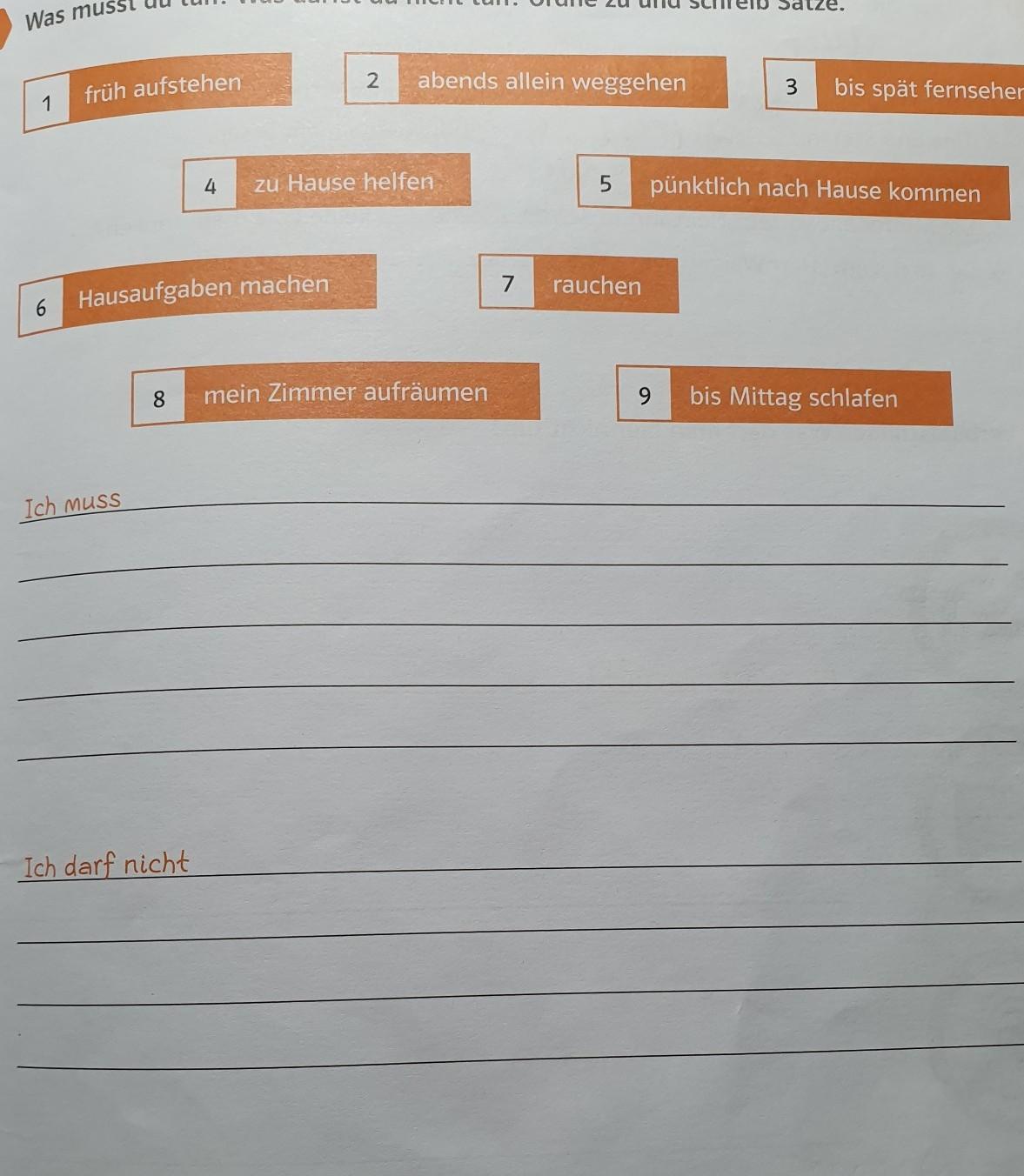 Ich muss frueh aufstehen. Ich muss zu Hause helfen. Ich muss puenktlich nach Hause kommen. Ich muss Hausaufgaben machen. Ich muss mein Zimmer aufraeumen.
